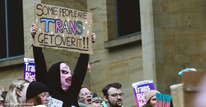 Note the sign the weird-looking – uh – person – is holding. It says “Some people are trans – get over it.” And you know what? I know some people are trans – they spend a lot of time making sure everyone knows it.